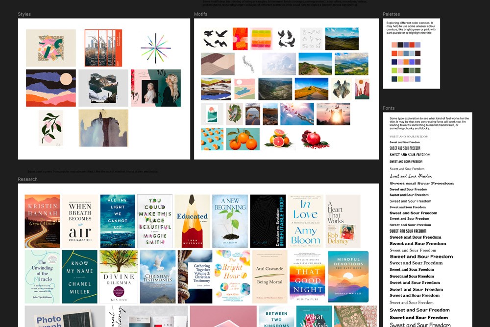 My research usually always includes exploring similar aesthetics and genres. I'll take note of visual tone, colour schemes, and typography, motifs, shapes, and forms I can use as a starting point. I also spend a bit of time exploring different typography to gauge the feel I want to pursue.