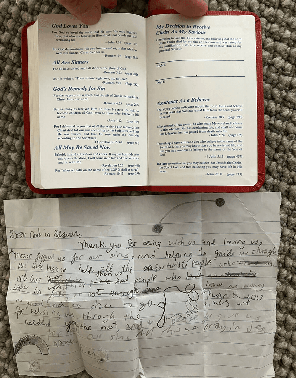 I had a small Gideon's Bible and I barely read a page of it, but at the back was the Romans Road to salvation. I remember reading it one night, and not really understanding it but I wrote down a prayer anyway, perhaps to help me pray better next time at church (the details are fuzzy). I folded and kept that prayer in that Bible for many years, forgetting all about it. God did not forget though (you must read to the end to find out what happened with that)!